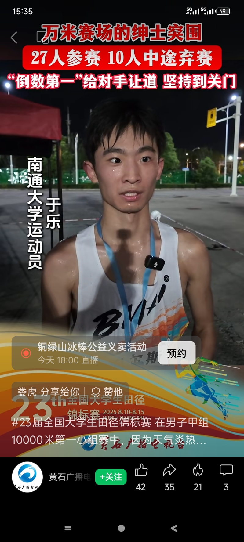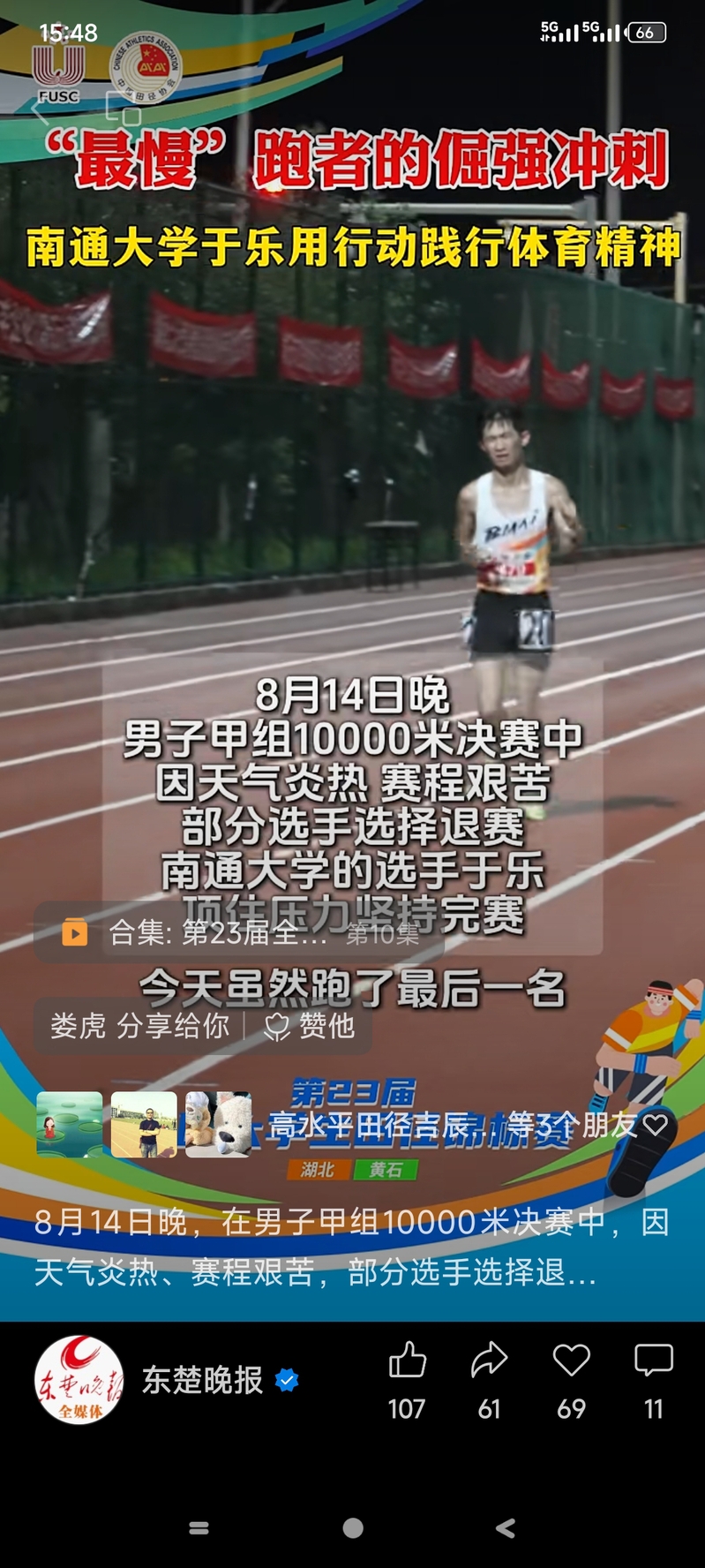 男子甲组10000米第一小组赛中,由于天气炎热,赛程艰苦,27人参赛,有10人中途弃赛,我校于乐同学展现出动人的体育风貌。于乐在处于“倒数第一”的位置时仍保持着绅士风度,给对手让道,并且坚持跑到了关门时刻。在决赛中,于乐同学顶住重重压力,凭借着顽强的毅力坚持完赛。他用坚持到底的倔强、尊重对手的风度,生动诠释了体育精神的内涵,成为赛场上一道别样且动人的风景,受到了黄石广播电视台、东楚晚报等媒体的关注与报道。让大家看到了我校运动员在竞技之外的优秀品质与精神力量。
