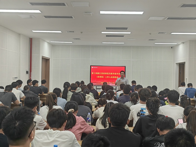 本次培训会以 “精准服务、安全护航” 为核心目标,采用集中培训与场地实操相结合的方式进行。会上,刘军书记首先发表讲话,强调了江苏省师范生基本功大赛对培养高素质体育教育人才、推动全省师范教育高质量发展的重要意义,并对全体工作人员提出明确要求,细致做好每一项服务,确保赛事零失误、零纰漏。