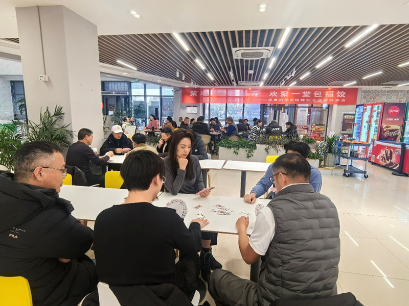 首先进行的是掼蛋活动,现场牌技切磋热烈,尽显棋牌运动的乐趣与魅力。接下来的包饺子环节,老师们纷纷化身“厨艺达人”,围坐在一起,动手包制寓意吉祥的饺子。男士们沉稳有力,擀出的饺子皮圆润均匀;女士们心灵手巧,包出的饺子造型精致。来自南方和北方的教职工也纷纷展示了各自家乡的包饺手法,在笑语中交流着不同地域的饮食文化,现场气氛热烈而欢快。当热乎乎的饺子端上餐桌,大家品尝着自己的劳动成果,分享着工作中的趣事与新年的展望,食堂内充满了欢声笑语,其乐融融。这一刻,工作的疲惫得以舒缓,同事间的情谊在温暖的氛围中进一步升华。