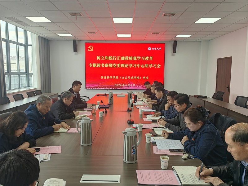 2026年4月9日上午,体育科学学院(支云足球学院)召开树立和践行正确政绩观学习教育专题读书班暨党委理论学习中心组学习会。会议聚焦深刻把握和践行正确政绩观的核心要义,结合学院工作实际,深入开展学习研讨与工作交流。会议由学院党委书记刘军主持,校党委常委、副校长徐骏,督导组成员张志刚、何建山、姚君莅会指导。